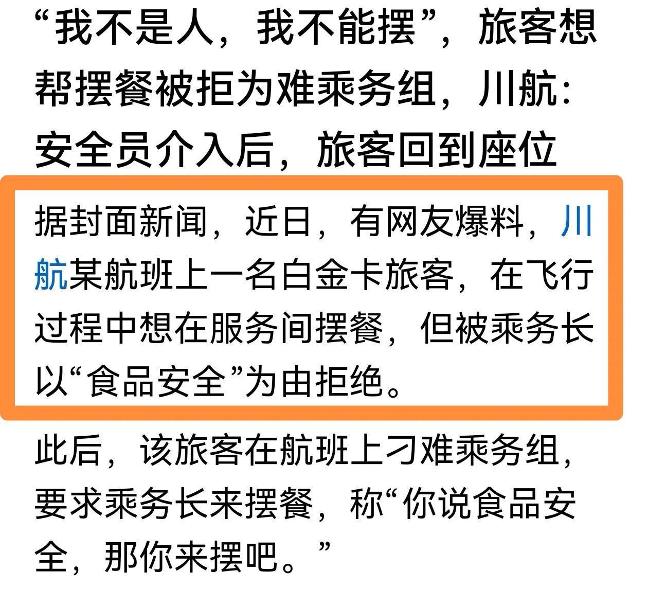 近日,有一则新闻:飞机上乘客想要摆餐,被工作人员拒绝,多次为难工作人员